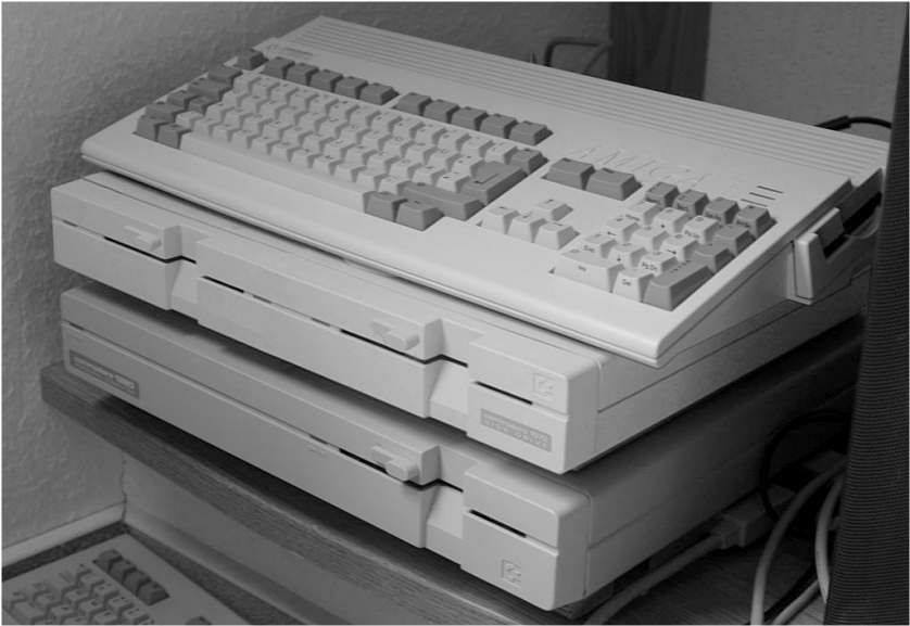 In the middle is the unreleased dual-1571 drive, called the 1572. Above it is an Amiga 500 and below it is a